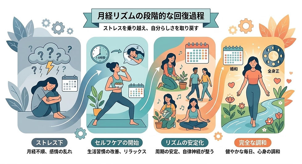 長期的なストレスによって心身が衰弱しきっている…という場合には、心身の状態が元に戻るのに時間がかかるので、当然、月経周期が戻るのにも時間がかかってしまいます。人によっては不妊を始めとした様々な不調の原因になることがありますので、ストレスによる調子悪さは放置せずに対策しなければなりません。